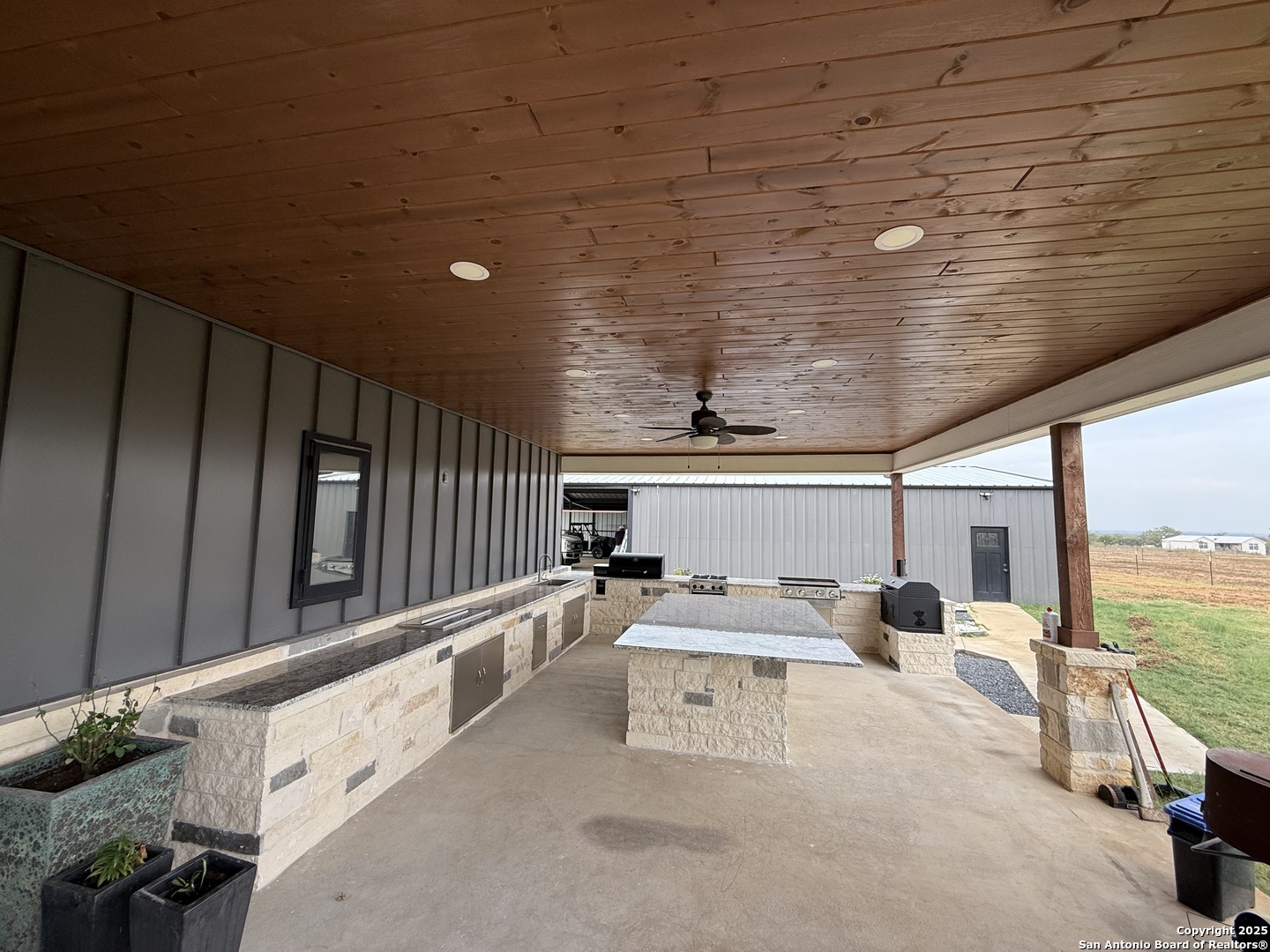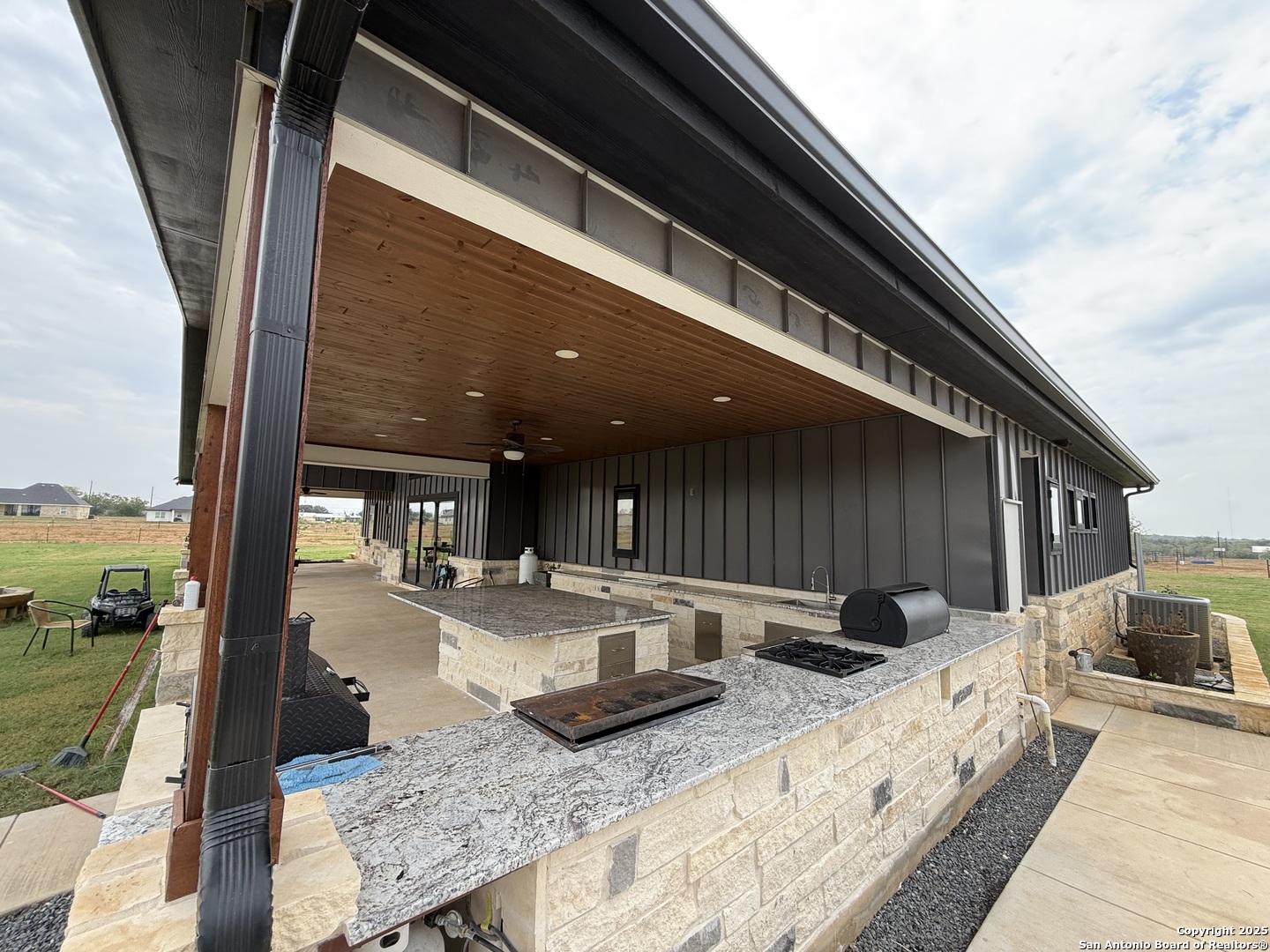 Welcome to this stunning, turn-key, single-story home nestled on 18 acres in Adkins Texas, southern Bexar County. Built in 2022, this 3-year-old home offers comfort and a sense of country living. With 5 spacious bedrooms and 3.5 bathrooms, this home is designed for both family living and entertaining. As you enter this beautiful custom Barndominium, you'll be greeted by an expansive open floor plan, featuring high ceilings throughout. The living room, measuring 21 x 24, is perfect for relaxing by the fireplace or hosting gatherings. The large kitchen is a chef's dream. The primary bedroom is a true retreat, measuring 15 x 19 with a beautiful and functional master bathroom with a spacious closet. Each of the four additional bedrooms are equally spacious, all measuring 11 x 12, making it ideal for guests or a growing family. The home also boasts a study/library and a convenient laundry and mud room. Beyond the home, the property offers exceptional infrastructure for both work and recreation. The property is fully fenced, and cross fenced. In addition, the owner has strategically drilled a well for agricultural purposes for the irrigation system for the yard, and the main home and shop utilizes coop water. A covered patio is connected to the main dwelling where the new homeowner will enjoy the beautiful views of the countryside. For those who need extra storage or space for hobbies, the property also includes a three-bay horse barn (36' x 40') complete with a 12' x 12' tack room, 12' x 12' feed room, and a 12' x 12' wash bay. For equipment and storage needs, there is a 76' x 45' equipment barn, a 36' x 40' shop, and an expansive 51' x 40' covered parking area. An unfinished 15' x 40' space attached to the shop and carport adds even more versatility to the property. This space could be turned into additional storage, an expanded workshop, or utilized however the new owner envisions. With a three-car garage, carport, and additional parking, there's ample room for all your vehicles and equipment. The property also has an ag valuation, offering additional tax benefits. This home is perfect for those seeking peace and privacy, yet still close to amenities and schools. Don't miss out on the opportunity to own this remarkable property, just a short drive to 1604, with easy access to the best of country living.