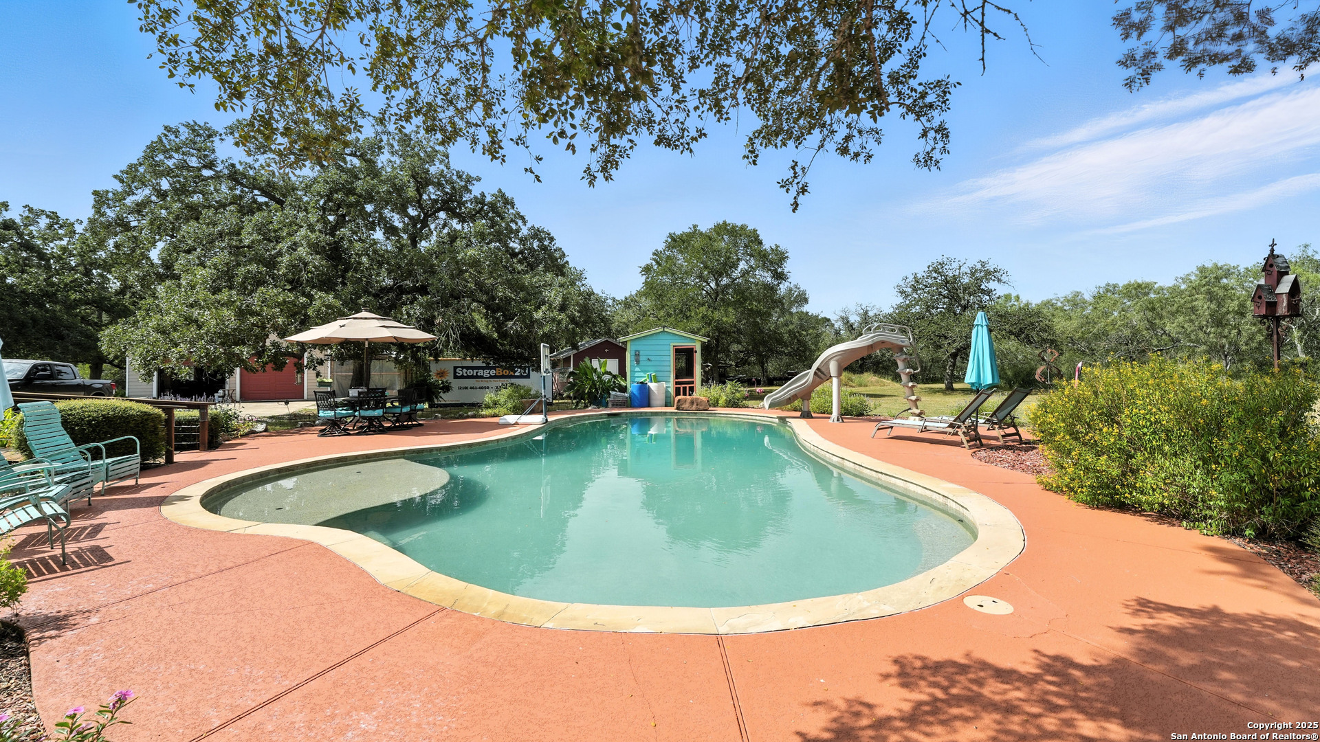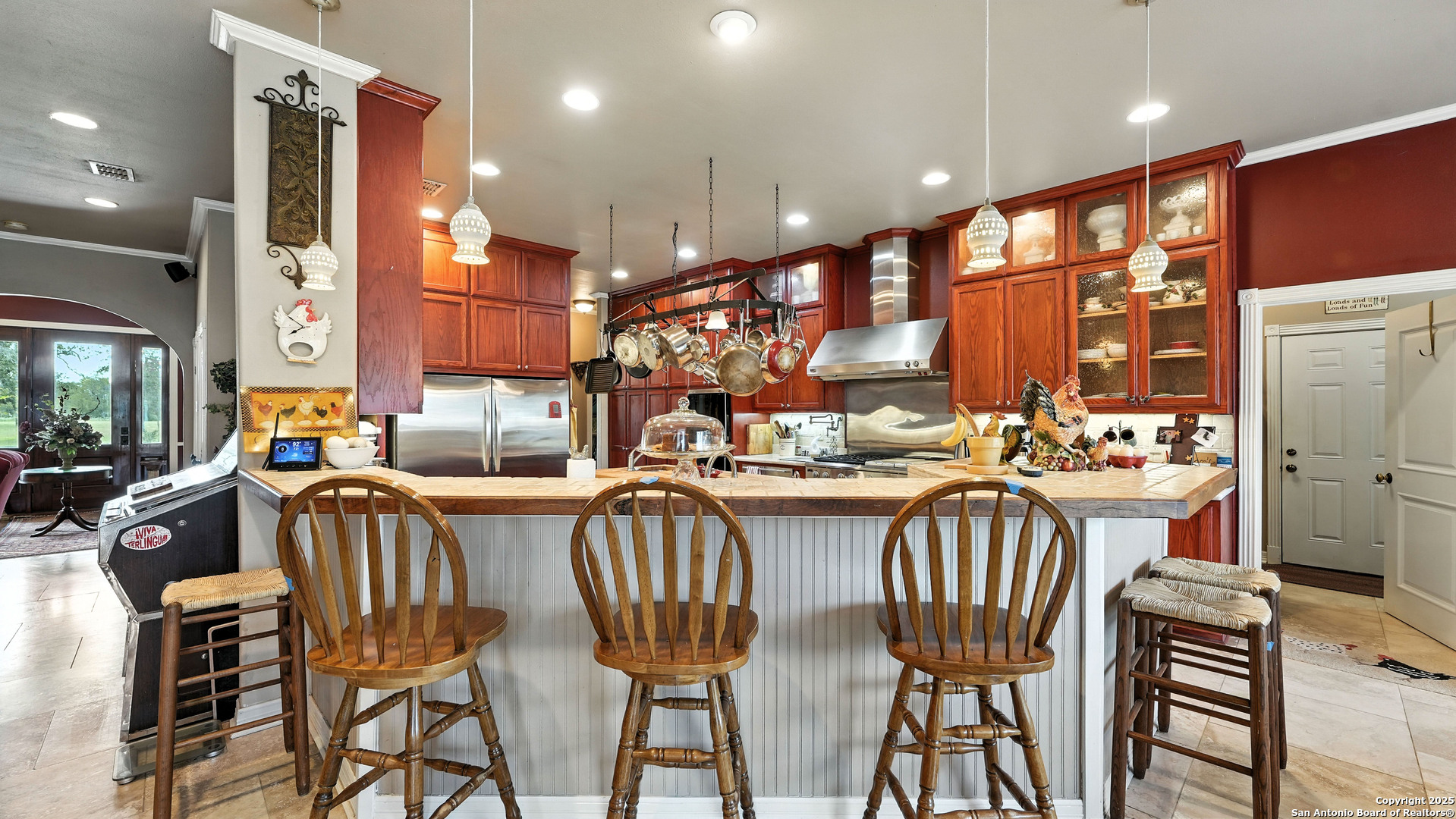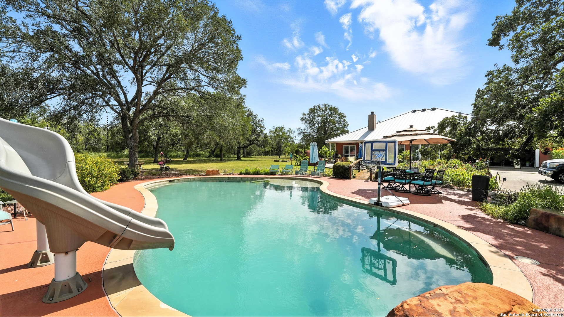 Exquisite 3,300 sq ft custom estate on 11+ unrestricted acres with a 1,000 sq ft covered porch, in-ground pool, and private guest casita. Chef's kitchen with premium appliances, commercial grade gas range and refrigerator, butcher block island, and butler's pantry. Thoughtful layout with formal living, dining, great room with fireplace, breakfast area, and office with murphy bed. Luxe primary suite with spa-style wet room, dual vanity, spacious his and hers closet, safe room and laundry access at the mudroom. Additional third bedroom with private en-suite. Outdoors offers a brick pizza oven, fire pit, greenhouse, garden, native brush, and abundant wildlife. 30x40 insulated workshop, 4-car carport, winding private driveway and ranch fencing. Ag valuation, new HVAC (2025), standing seam metal roof, and fiber internet. Select furnishings negotiabl