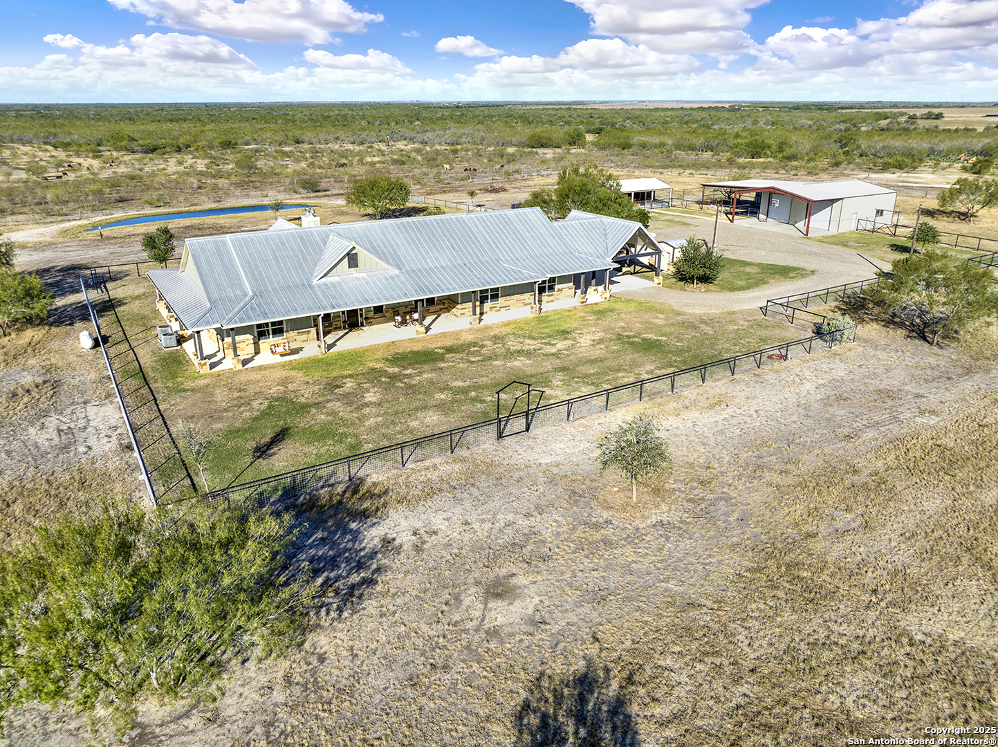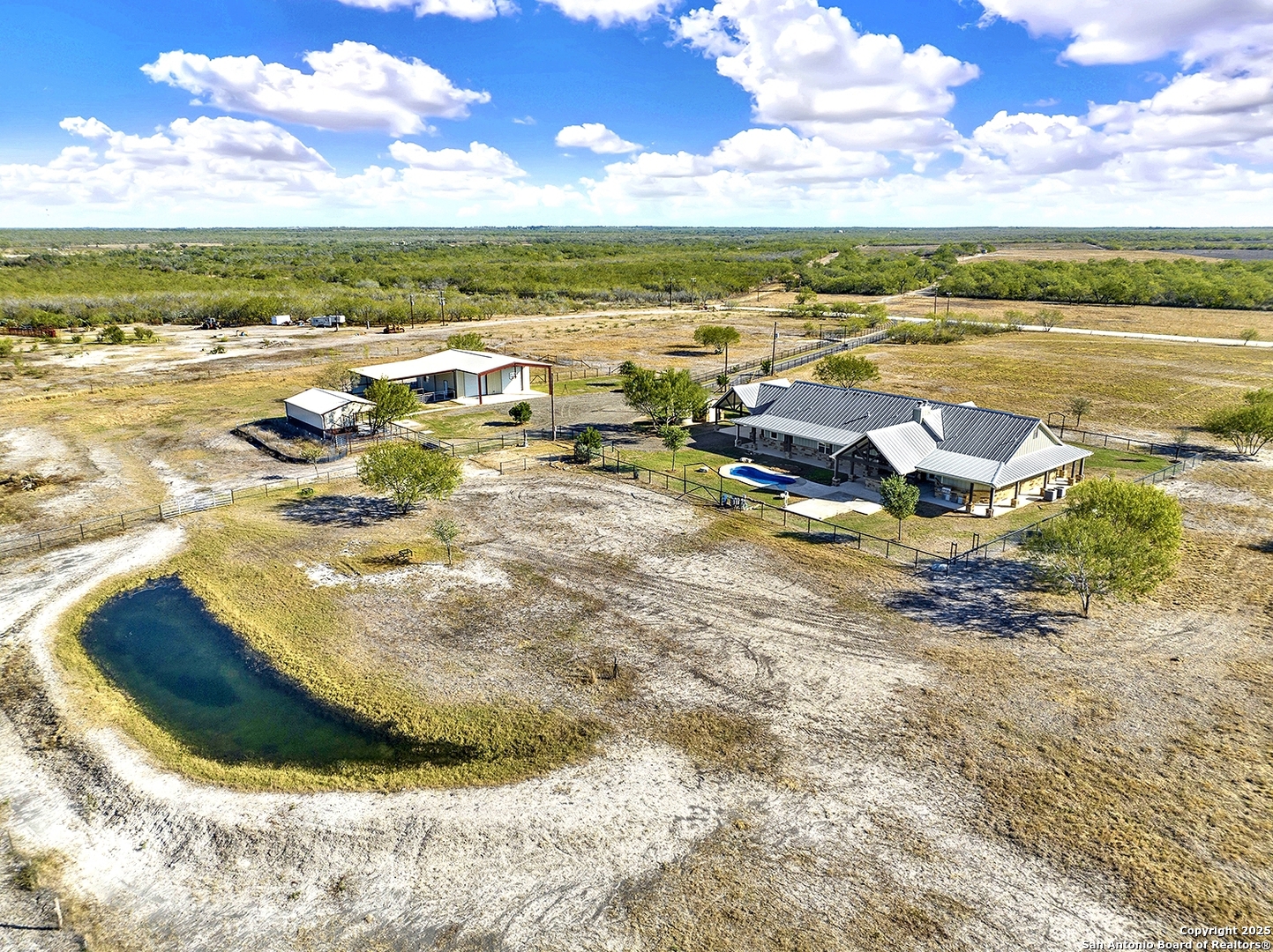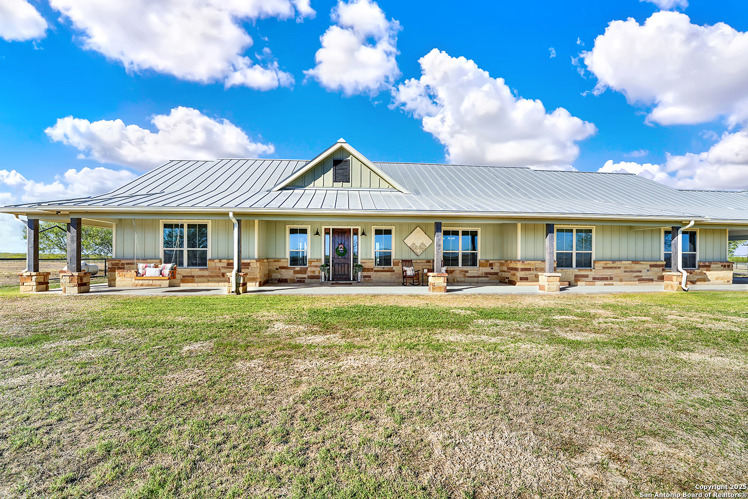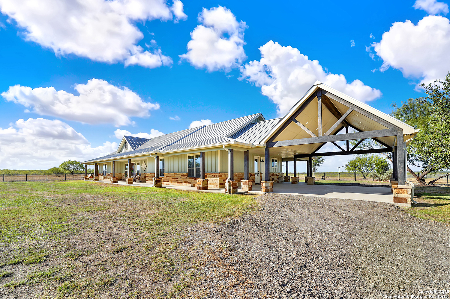 Welcome to this stunning country retreat on 23 acres; fully fenced, with 2 stock tanks in Poth ISD. It features a Gorgeous 4 bedroom, 3 full bathroom, rock and hardi plank home. Large open carport for covered parking. The Large front porch welcomes you into an open, spacious living area complete with wood beam trusses, ceiling to floor rock fireplace, custom built ins, custom woodwork throughout and a modern gourmet farm island kitchen with double ovens, large 6 burner gas stove, stainless fridge, ice maker, and double kitchen sink with a view of the backyard. Head to the master suite with two walk in closets, antique claw foot tub with walk around shower w/2 shower heads. Newly updated tile throughout the house. Large secondary bedrooms with a jack/jill bath between 2 of the rooms and a full back with outdoor access to the back porch for easy pool access. The laundry room is a dream space you will love with lots of counter space, sink, cabinets, and a built in ironing board. Home also features a central vac system throughout with sweepers. The outdoor oasis is sure to make your home the place to be with a full wrap around porch, huge covered back patio, outdoor built in cooking area with grill and fridge. The beautiful pool tops off this incredible outdoor entertaining space! 1600 sqft. Metal shop with covered parking and awning for a covered work area for livestock or equipment. It also features a 3 stall barn w/ tack room ready for you to bring your livestock with you. Lots of Pipe fencing lines the entry with electric gate and enclosed yard. The back of the property features a large stock tank behind the house and a nice smaller stock tank up in front of the property. The countryside views are vast and makes this property feel so private. You don't want to miss seeing this stunning property and all is has to offer, make it yours today!