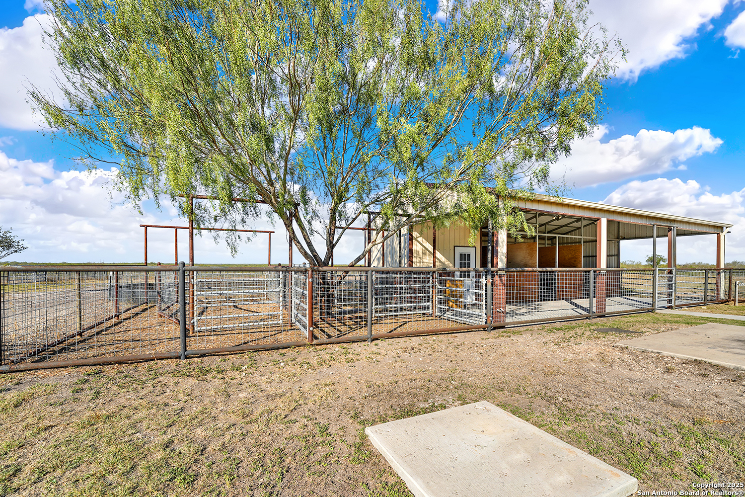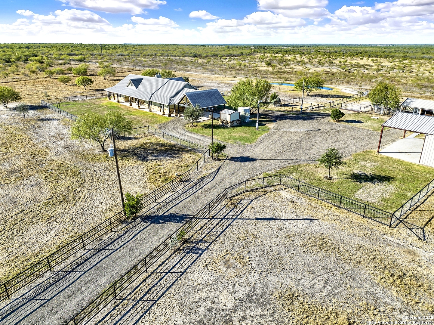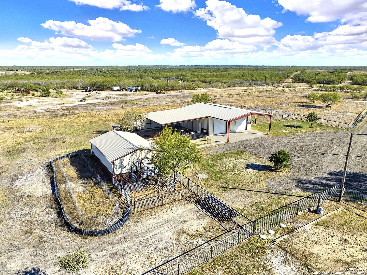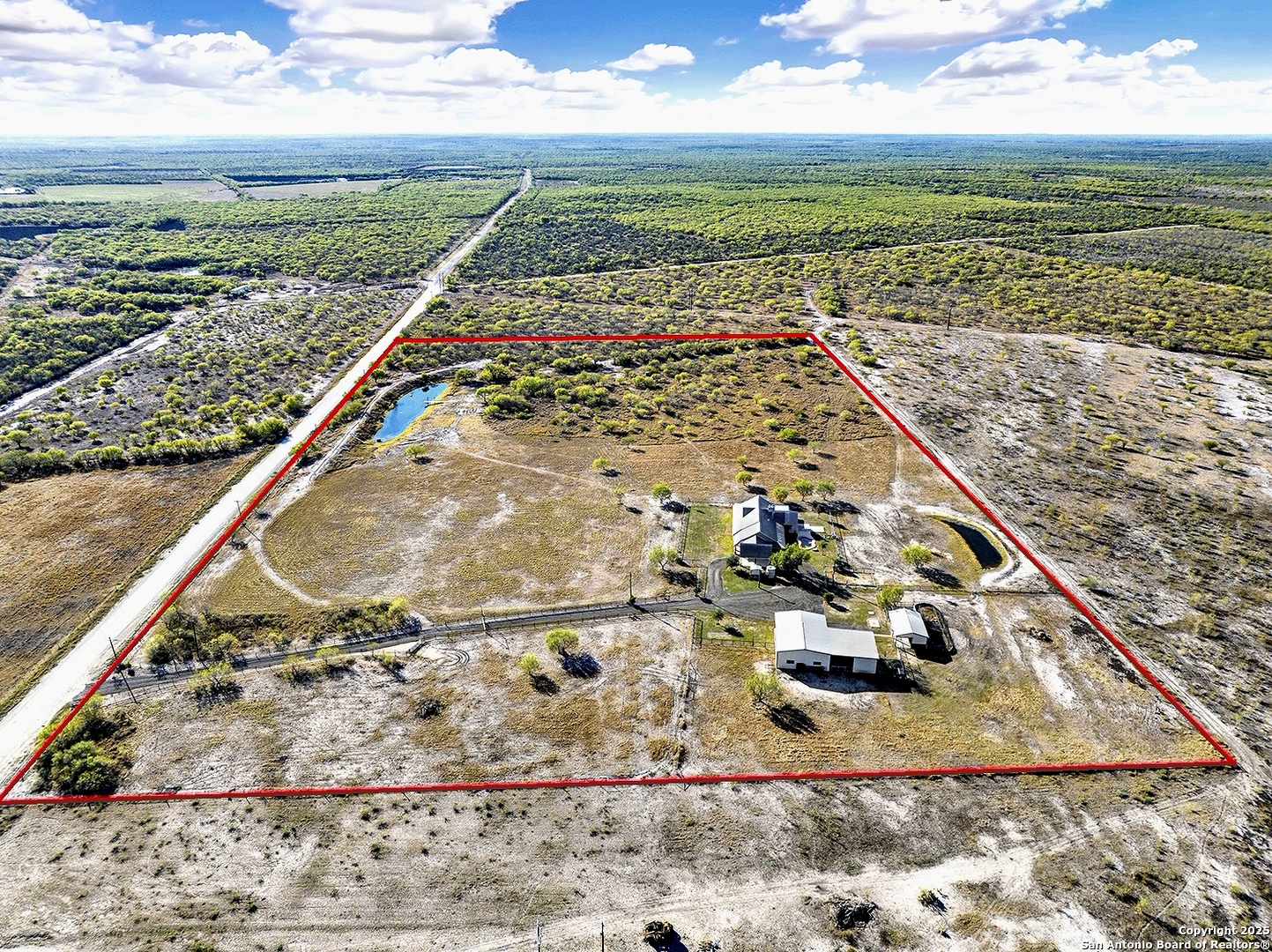 Welcome to this stunning country retreat on 23 acres; fully fenced, with 2 stock tanks in Poth ISD. It features a Gorgeous 4 bedroom, 3 full bathroom, rock and hardi plank home. Large open carport for covered parking. The Large front porch welcomes you into an open, spacious living area complete with wood beam trusses, ceiling to floor rock fireplace, custom built ins, custom woodwork throughout and a modern gourmet farm island kitchen with double ovens, large 6 burner gas stove, stainless fridge, ice maker, and double kitchen sink with a view of the backyard. Head to the master suite with two walk in closets, antique claw foot tub with walk around shower w/2 shower heads. Newly updated tile throughout the house. Large secondary bedrooms with a jack/jill bath between 2 of the rooms and a full back with outdoor access to the back porch for easy pool access. The laundry room is a dream space you will love with lots of counter space, sink, cabinets, and a built in ironing board. Home also features a central vac system throughout with sweepers. The outdoor oasis is sure to make your home the place to be with a full wrap around porch, huge covered back patio, outdoor built in cooking area with grill and fridge. The beautiful pool tops off this incredible outdoor entertaining space! 1600 sqft. Metal shop with covered parking and awning for a covered work area for livestock or equipment. It also features a 3 stall barn w/ tack room ready for you to bring your livestock with you. Lots of Pipe fencing lines the entry with electric gate and enclosed yard. The back of the property features a large stock tank behind the house and a nice smaller stock tank up in front of the property. The countryside views are vast and makes this property feel so private. You don't want to miss seeing this stunning property and all is has to offer, make it yours today!