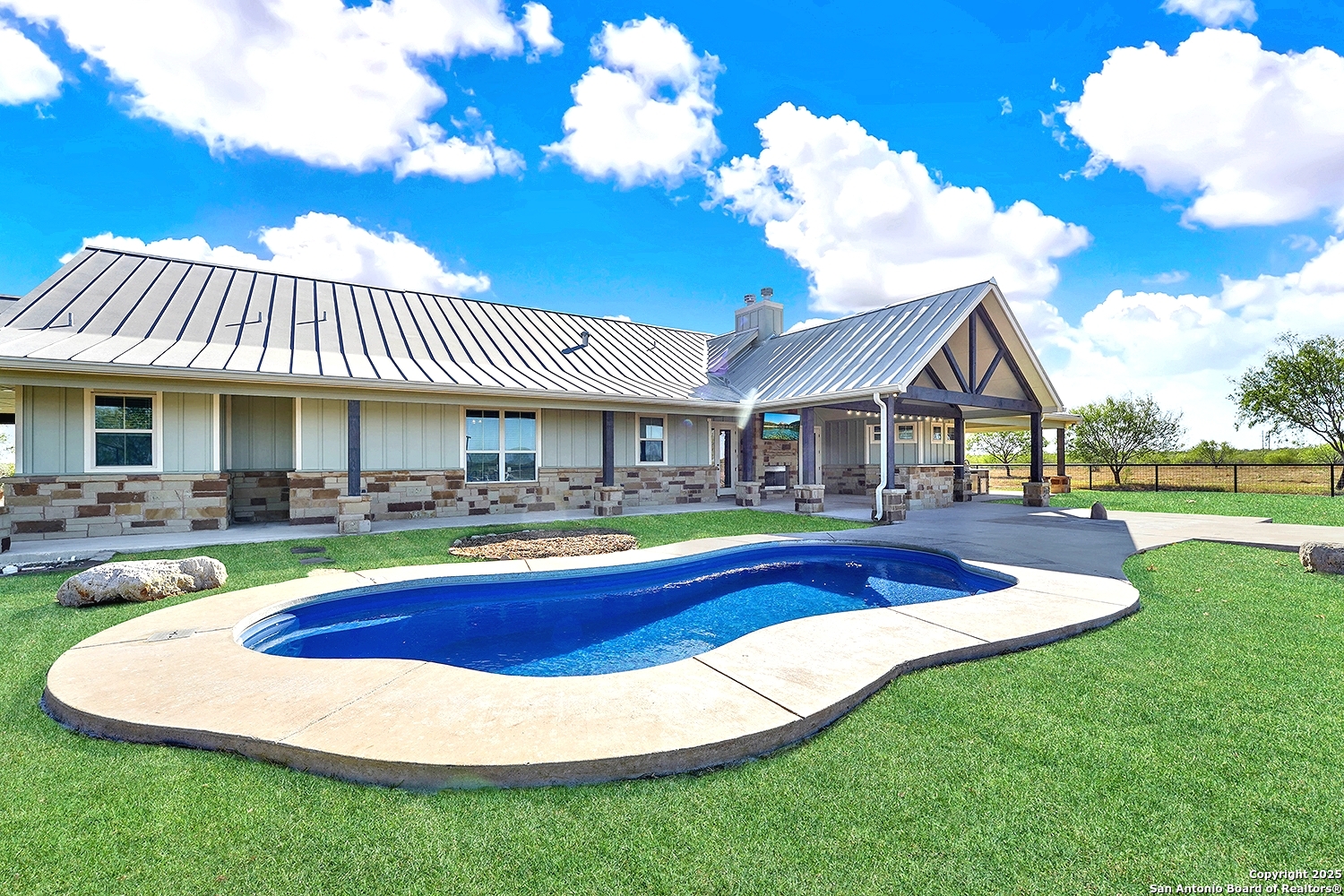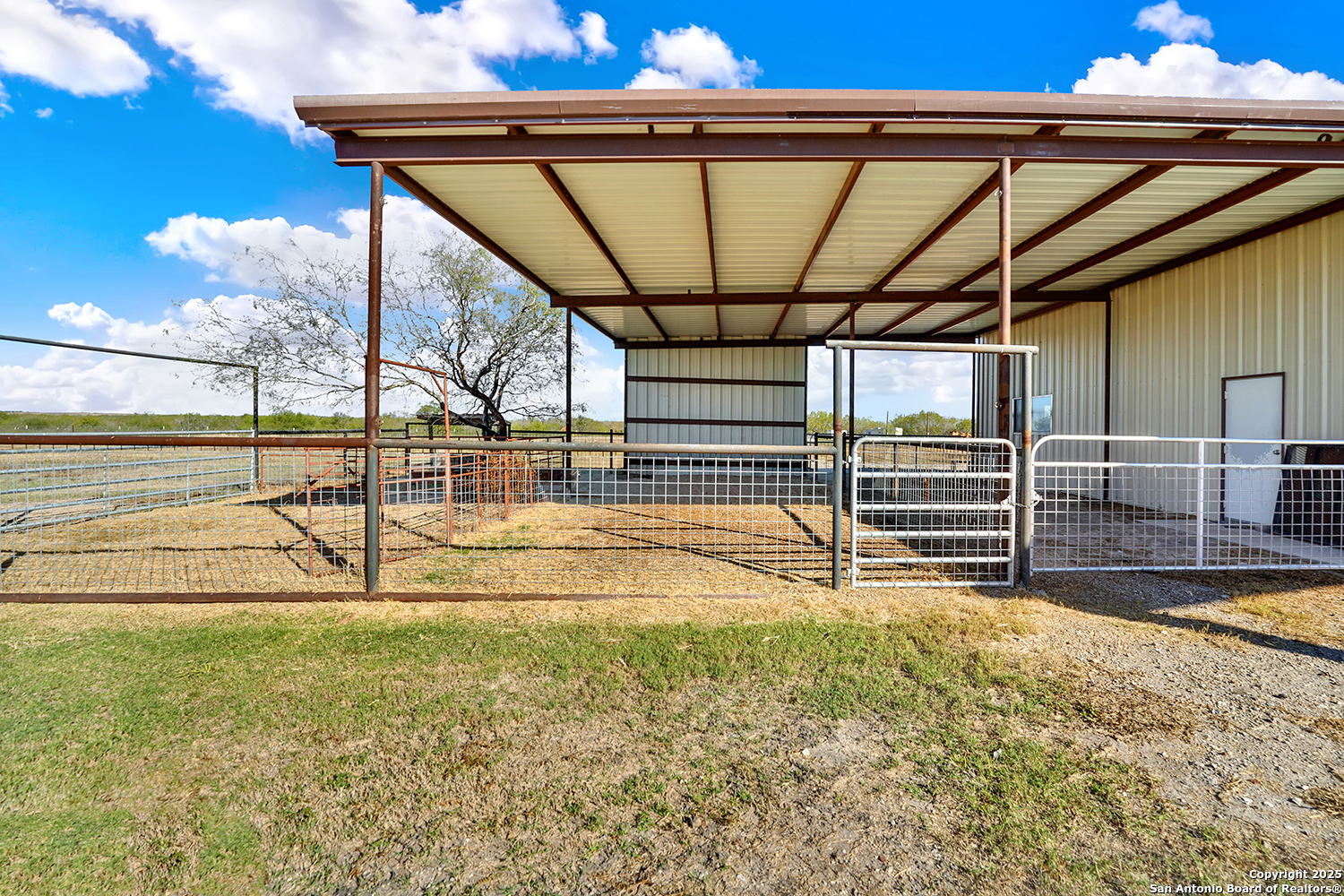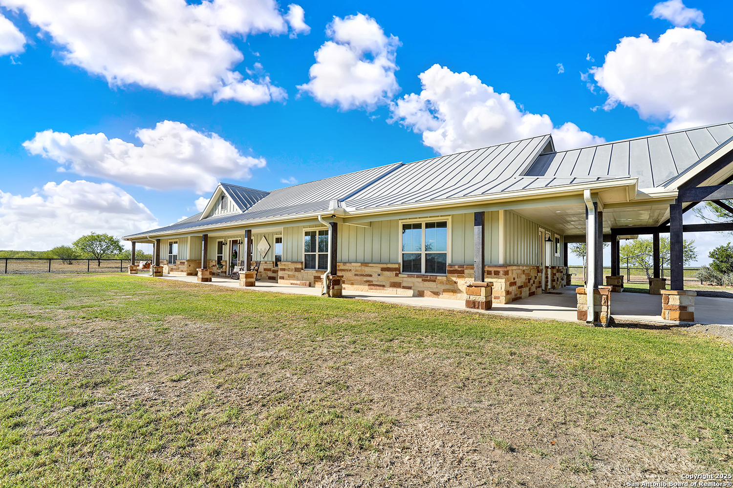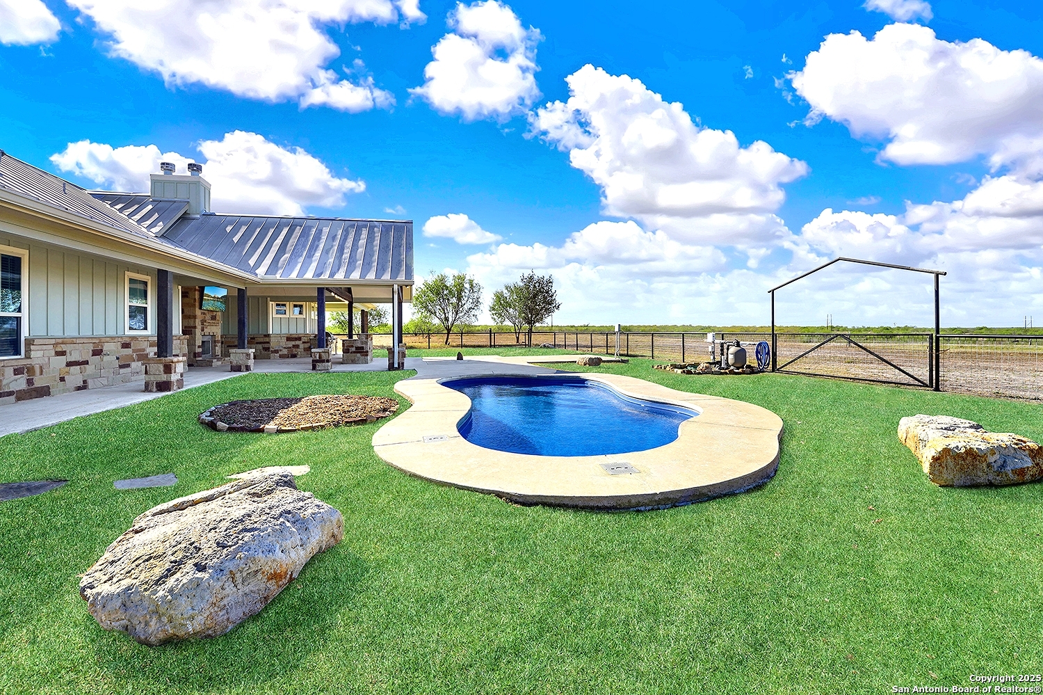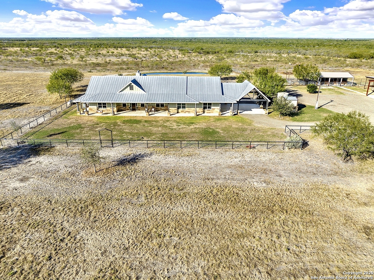 Welcome to this stunning country retreat on 23 acres; fully fenced, with 2 stock tanks in Poth ISD. It features a Gorgeous 4 bedroom, 3 full bathroom, rock and hardi plank home. Large open carport for covered parking. The Large front porch welcomes you into an open, spacious living area complete with wood beam trusses, ceiling to floor rock fireplace, custom built ins, custom woodwork throughout and a modern gourmet farm island kitchen with double ovens, large 6 burner gas stove, stainless fridge, ice maker, and double kitchen sink with a view of the backyard. Head to the master suite with two walk in closets, antique claw foot tub with walk around shower w/2 shower heads. Newly updated tile throughout the house. Large secondary bedrooms with a jack/jill bath between 2 of the rooms and a full back with outdoor access to the back porch for easy pool access. The laundry room is a dream space you will love with lots of counter space, sink, cabinets, and a built in ironing board. Home also features a central vac system throughout with sweepers. The outdoor oasis is sure to make your home the place to be with a full wrap around porch, huge covered back patio, outdoor built in cooking area with grill and fridge. The beautiful pool tops off this incredible outdoor entertaining space! 1600 sqft. Metal shop with covered parking and awning for a covered work area for livestock or equipment. It also features a 3 stall barn w/ tack room ready for you to bring your livestock with you. Lots of Pipe fencing lines the entry with electric gate and enclosed yard. The back of the property features a large stock tank behind the house and a nice smaller stock tank up in front of the property. The countryside views are vast and makes this property feel so private. You don't want to miss seeing this stunning property and all is has to offer, make it yours today!