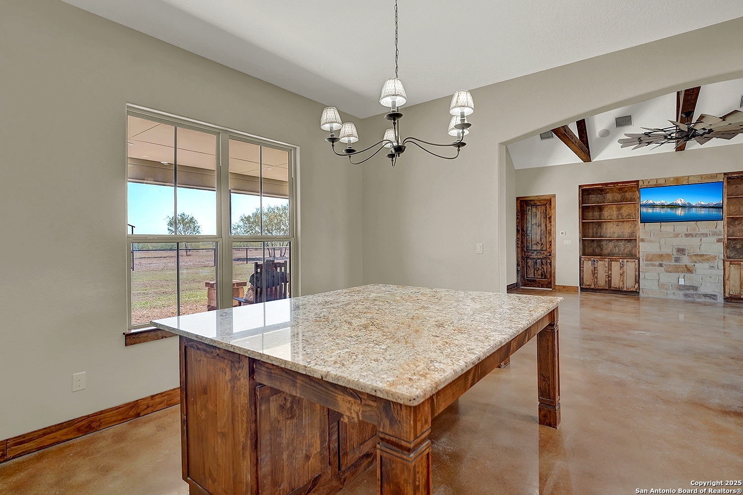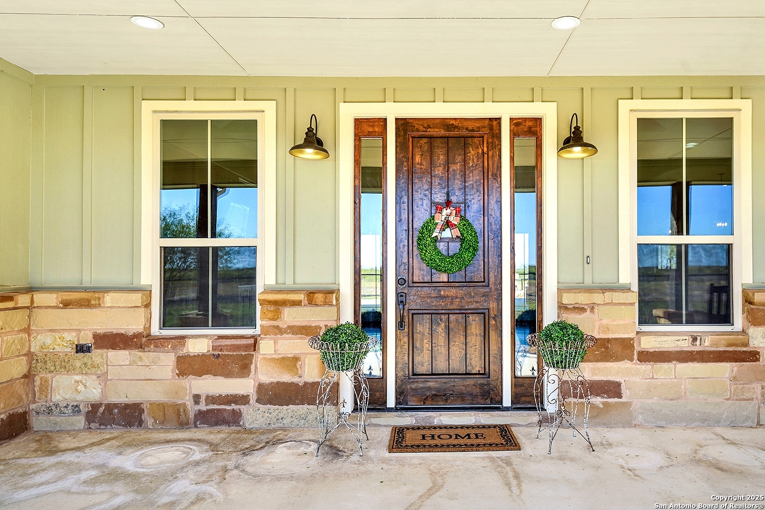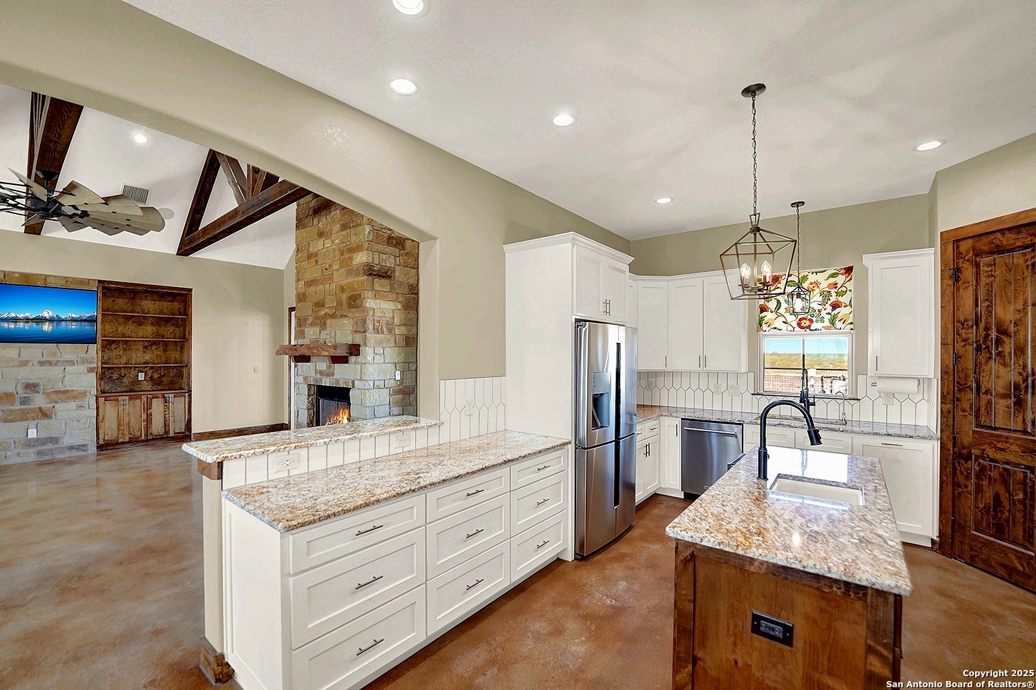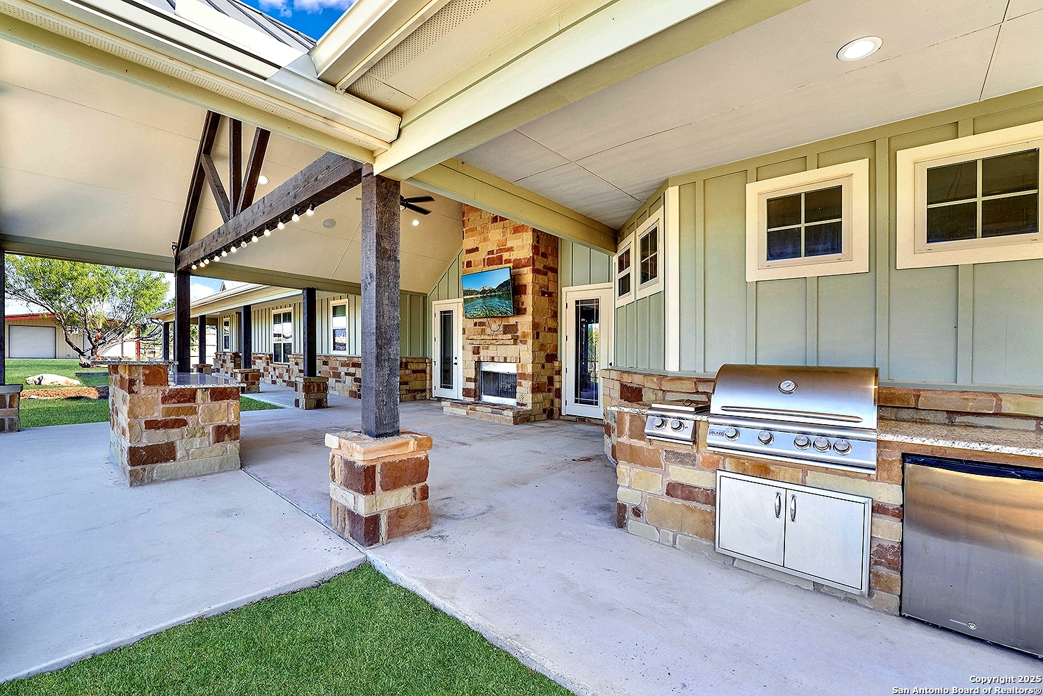 Welcome to this stunning country retreat on 23 acres; fully fenced, with 2 stock tanks in Poth ISD. It features a Gorgeous 4 bedroom, 3 full bathroom, rock and hardi plank home. Large open carport for covered parking. The Large front porch welcomes you into an open, spacious living area complete with wood beam trusses, ceiling to floor rock fireplace, custom built ins, custom woodwork throughout and a modern gourmet farm island kitchen with double ovens, large 6 burner gas stove, stainless fridge, ice maker, and double kitchen sink with a view of the backyard. Head to the master suite with two walk in closets, antique claw foot tub with walk around shower w/2 shower heads. Newly updated tile throughout the house. Large secondary bedrooms with a jack/jill bath between 2 of the rooms and a full back with outdoor access to the back porch for easy pool access. The laundry room is a dream space you will love with lots of counter space, sink, cabinets, and a built in ironing board. Home also features a central vac system throughout with sweepers. The outdoor oasis is sure to make your home the place to be with a full wrap around porch, huge covered back patio, outdoor built in cooking area with grill and fridge. The beautiful pool tops off this incredible outdoor entertaining space! 1600 sqft. Metal shop with covered parking and awning for a covered work area for livestock or equipment. It also features a 3 stall barn w/ tack room ready for you to bring your livestock with you. Lots of Pipe fencing lines the entry with electric gate and enclosed yard. The back of the property features a large stock tank behind the house and a nice smaller stock tank up in front of the property. The countryside views are vast and makes this property feel so private. You don't want to miss seeing this stunning property and all is has to offer, make it yours today!