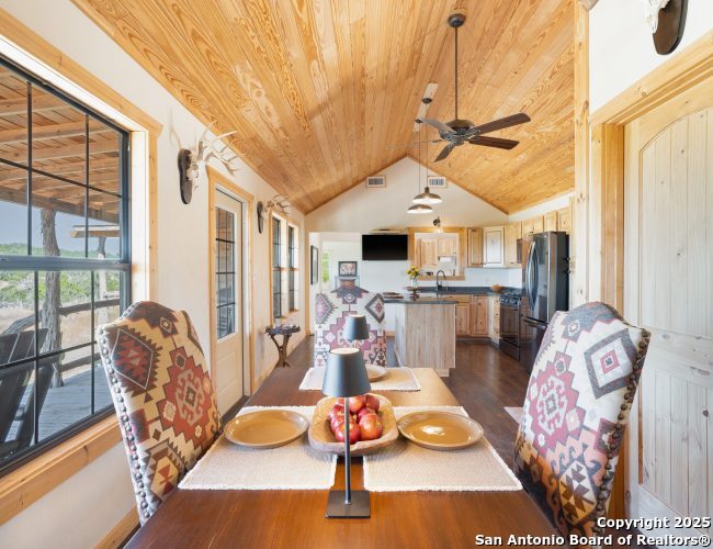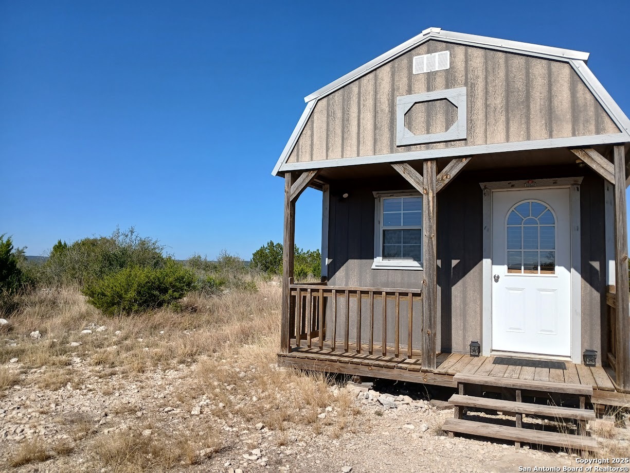 Pinon Canyon Ranch is a 271.27-acre property in Edwards County, Texas, offering a full-time residence, guest accommodations for 5 people, turnkey hunting and recreation in one complete package. Located within a private, peaceful setting, the property features scenic, panoramic views that stretch for miles. The terrain is varied, with canyons, rolling hills, gentle valleys, and native grass flats. Access is easy, only 20 minutes from Rocksprings on paved roads. The main home is a 1,250-square-foot custom build with covered porches offering spectacular sunset and night sky views, vaulted pine ceilings, hickory cabinets throughout and oversized windows framing private Hill Country vistas. The perfect blend of rustic charm and modern comfort, the home features an open kitchen and living area, a large mudroom with a wall of cabinets for extra storage, and a spacious master suite with 2 walk-in closets. Utilities include a deep-water well, licensed septic, central AC and heat, and full electrical service. The ranch also includes a fully furnished guest cabin featuring a kitchenette, bath and sleeping loft, a storage building with HVAC, and ample parking for vehicles and RVs. The property is well improved for hunting with five blinds (some with bunks), twelve feeders, three water stations, a 200-yard shooting range and an internal road system that provides access throughout. Wildlife includes whitetail, axis, aoudad, turkey, hogs and more. The ranch carries a wildlife exemption and is surrounded by managed properties with a long history of conservation. Don't miss this opportunity to own a unique Hill Country retreat with both primary home and guest quarters already in place.