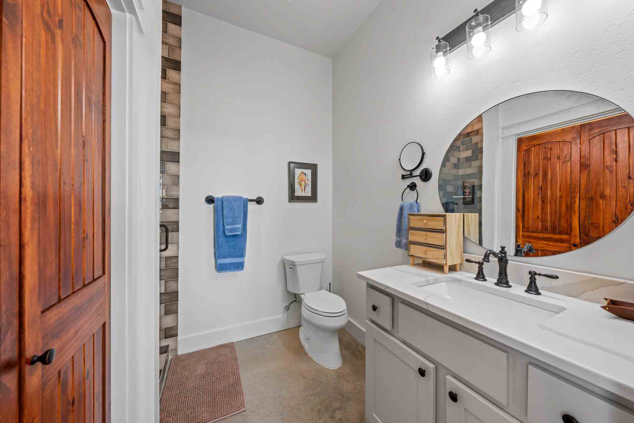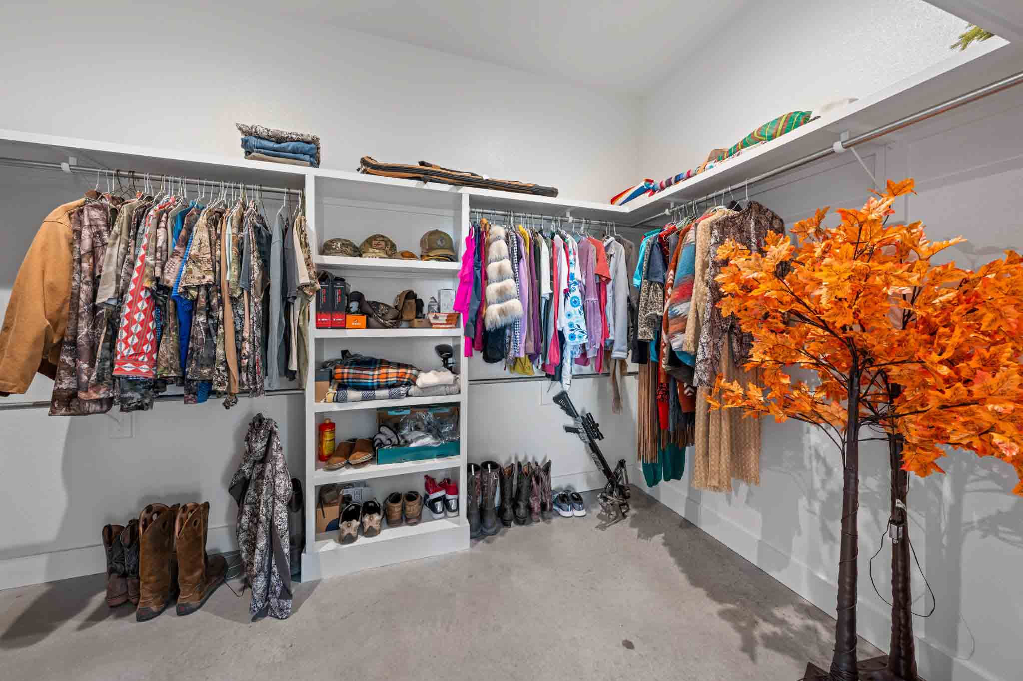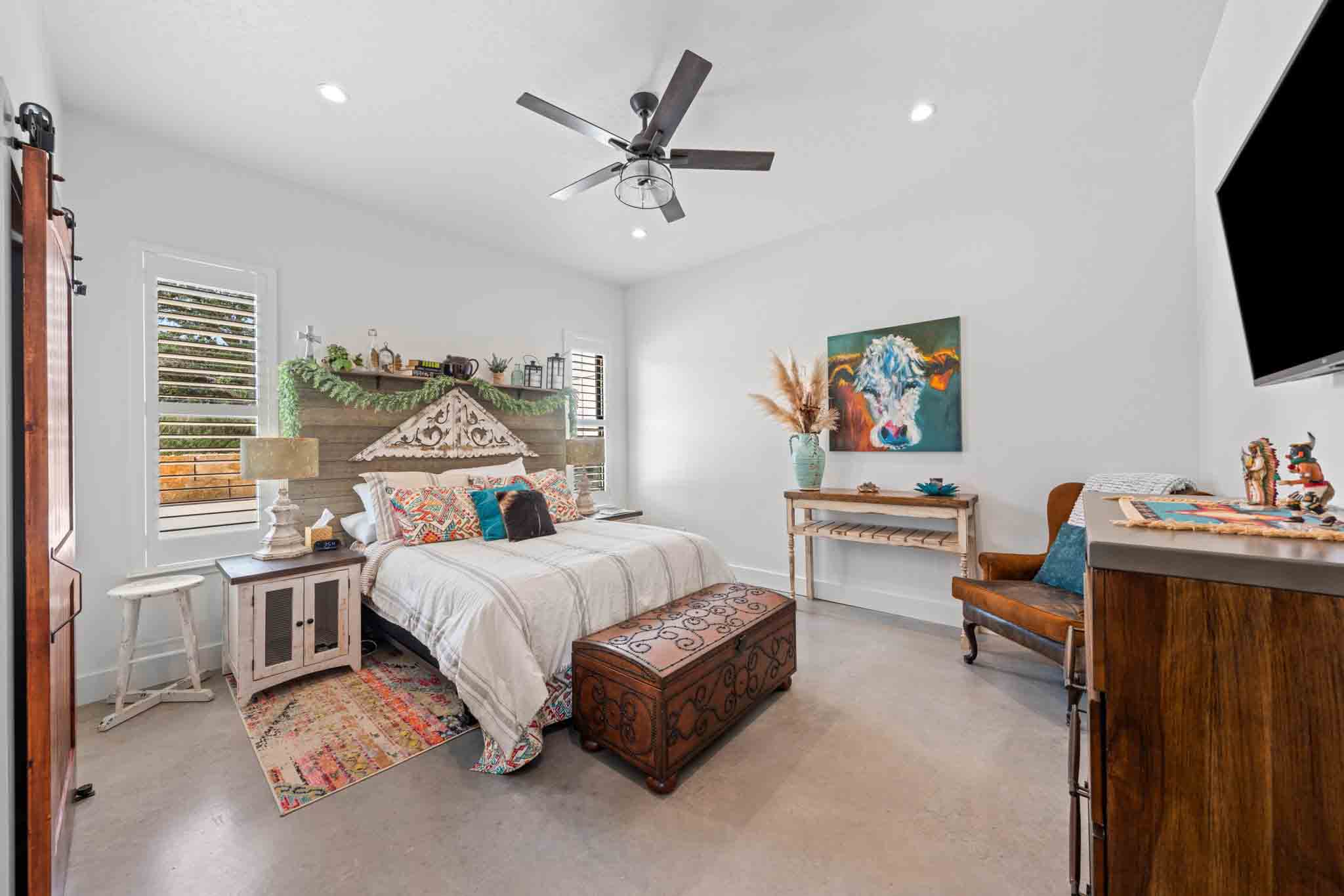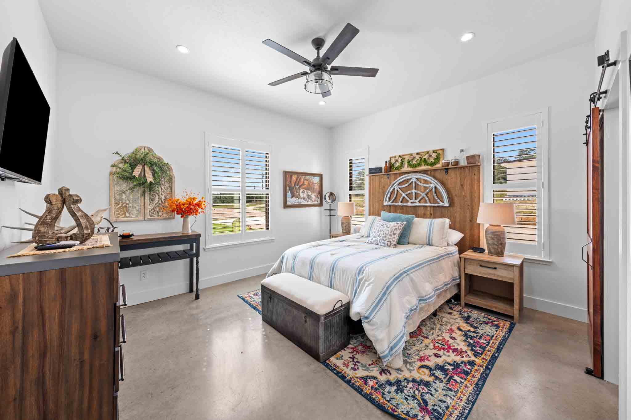 Big Chief Ranch features a 3,085± sf four-bedroom/four-and-a-half-bathroom main home that offers an inviting, open-concept floor plan, seamlessly joining the gourmet kitchen, living room, and dining spaces. The kitchen boasts custom cabinetry, stainless steel appliances, a large quartz island, a walk-in pantry, and a wet bar with a wine refrigerator. Vaulted ceilings and large windows in the living room showcase stunning Hill Country views while filling the home with natural light. Each bedroom features a private en-suite bathroom and walk-in closet, with the primary suite offering a double vanity, expansive countertop space, and an enormous walk-in closet. Custom window coverings and automatic shades enhance both the style and convenience of this stunning home.