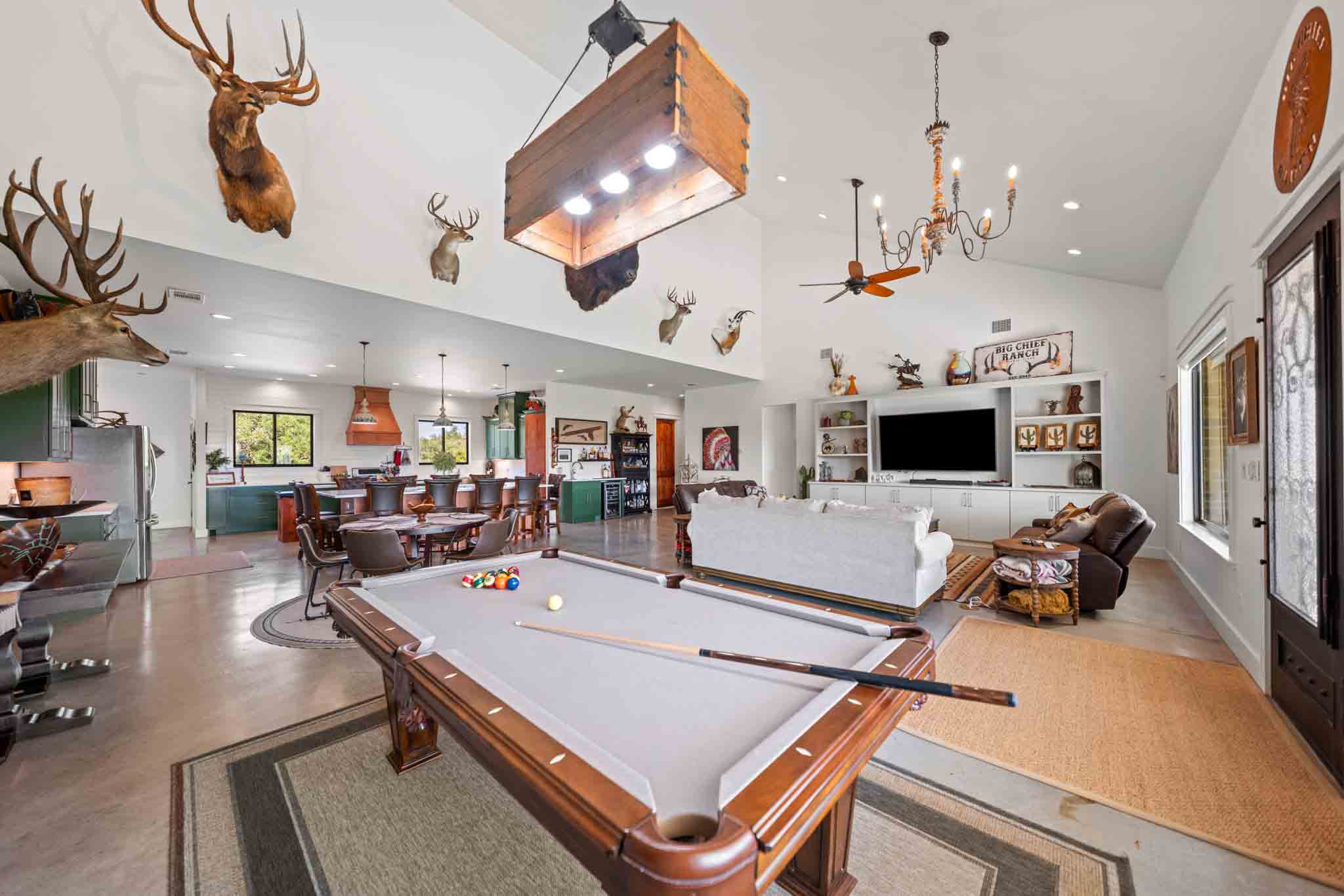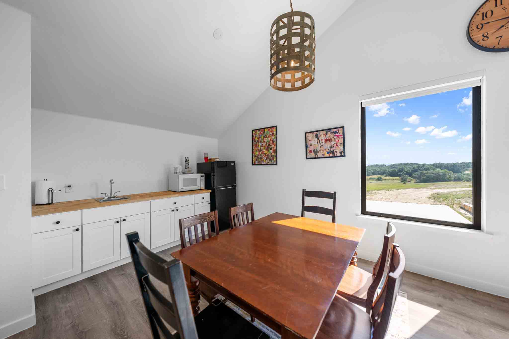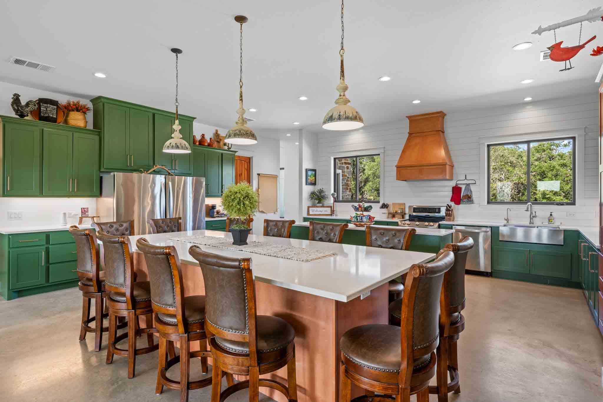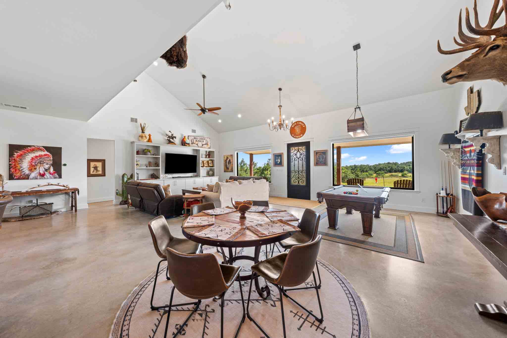 Big Chief Ranch was designed with entertaining and comfort in mind. Completed in 2021, its primary residence offers an open-concept floor plan that seamlessly connects the gourmet kitchen, living room, and dining spaces. The kitchen boasts custom cabinetry, stainless steel appliances, a large quartz island, a walk-in pantry, and a wet bar with a wine refrigerator. Vaulted ceilings and large windows in the living room showcase stunning Hill Country views while filling the home with natural light. Each bedroom features a private en-suite bathroom and walk-in closet, with the primary suite offering a double vanity, expansive countertop space, and an enormous walk-in closet. Custom window coverings and automatic shades enhance both the style and convenience of this stunning home.