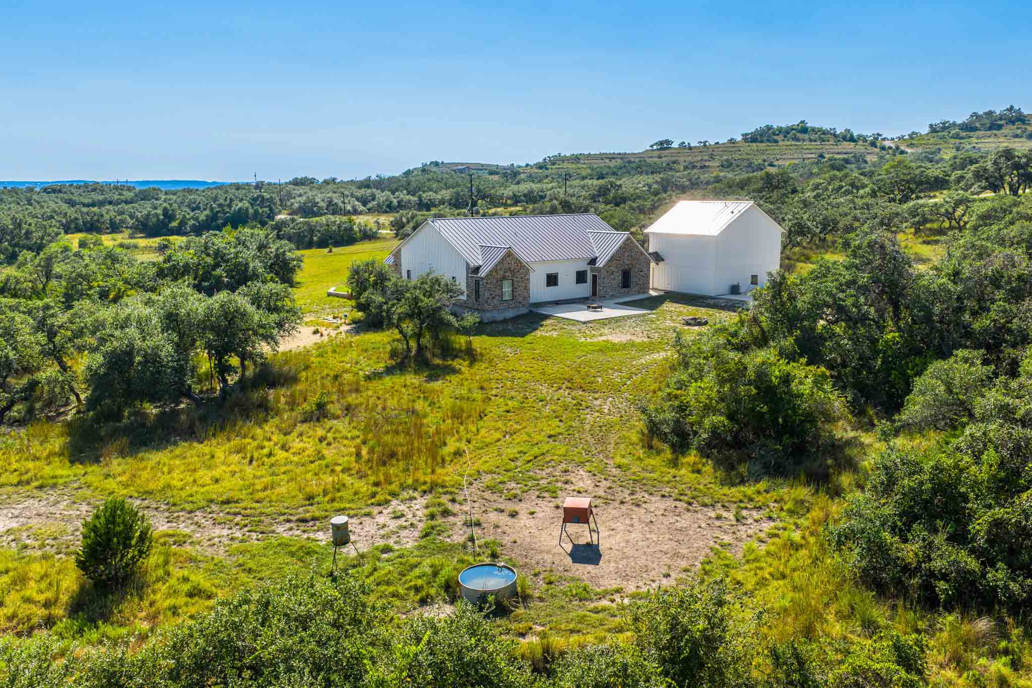 Exceptionally beautiful and well-located—Big Chief Ranch is 26± acres, offering luxurious modern living with an impressive Hill Country landscape backdrop featuring rolling hills in the distance. The property features a 3,085± sf main home, a detached garage with an upstairs guest apartment, and gentle rolling terrain dotted with mature live oaks, native grasses, and a stock tank.
