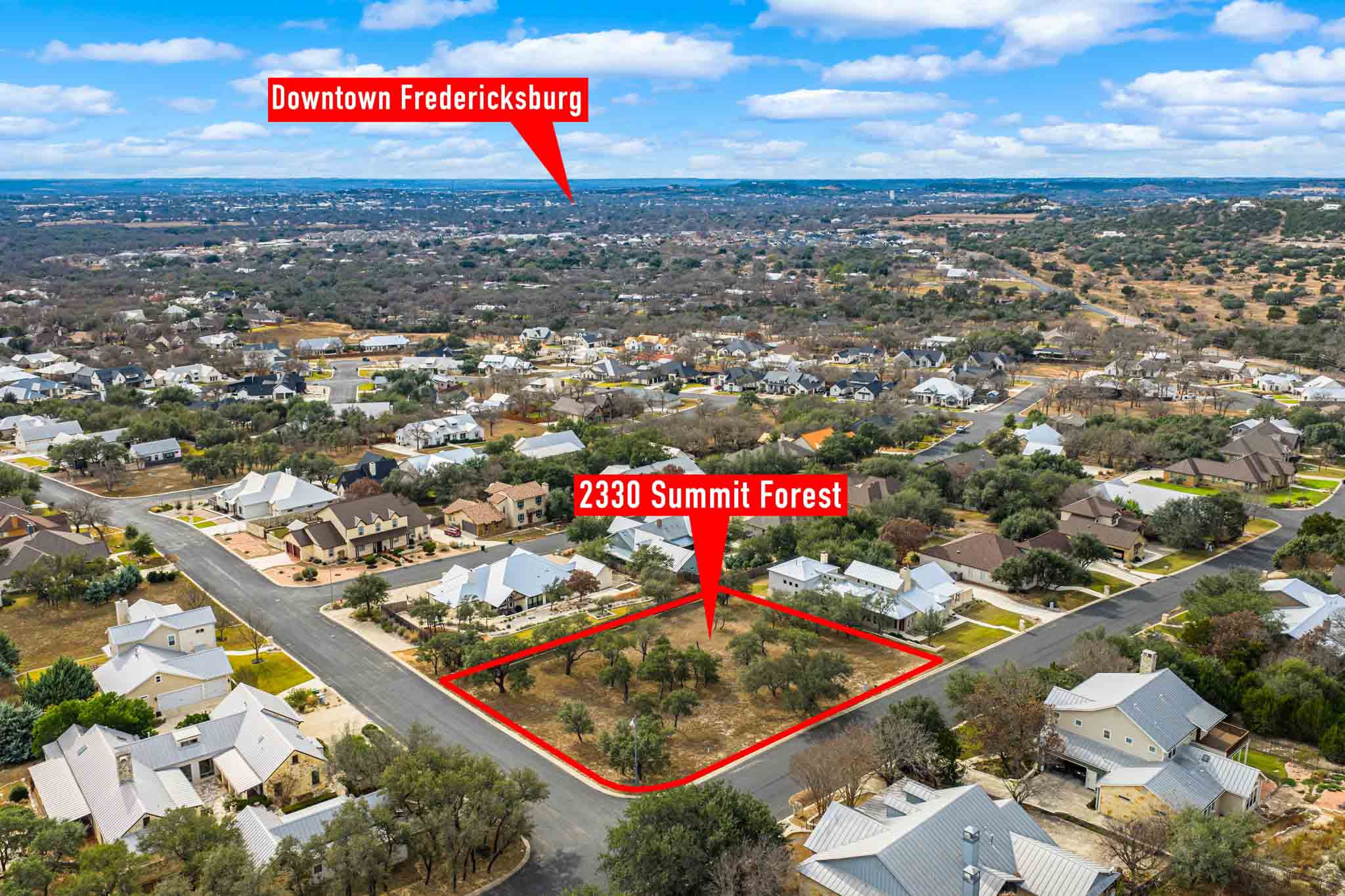 2330 Summit Forest is a 0.631± acre corner lot located in the highly desirable Stone Ridge Subdivision, offering an exceptional opportunity to build a custom home in one of Fredericksburg’s most sought-after neighborhoods. With gently rolling topography, mature live oaks, underground utilities, and attractive Hill Country views, this property combines natural beauty with convenience and long-term value.