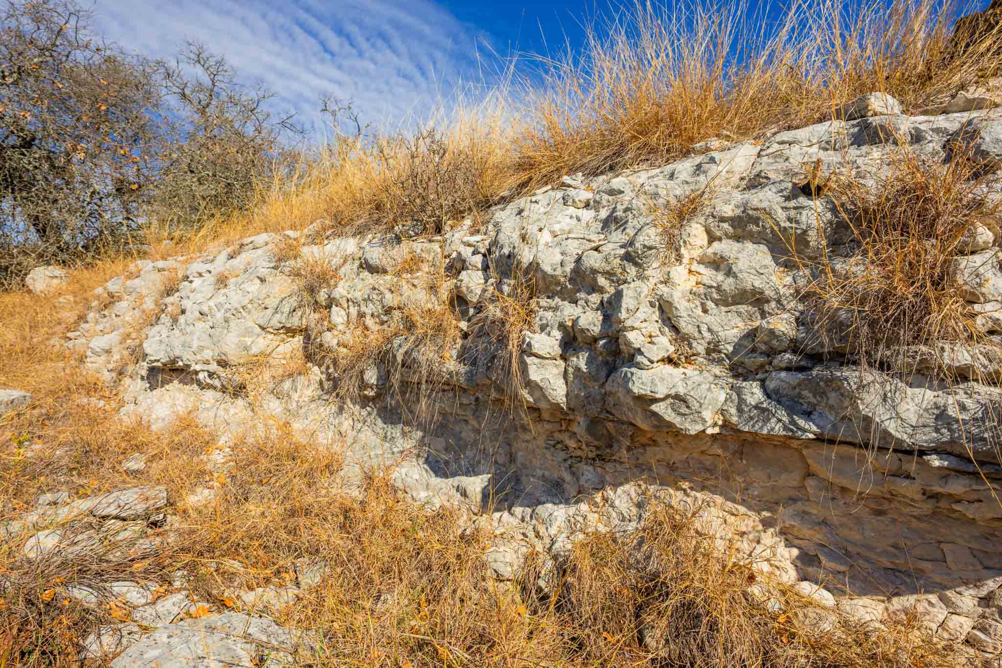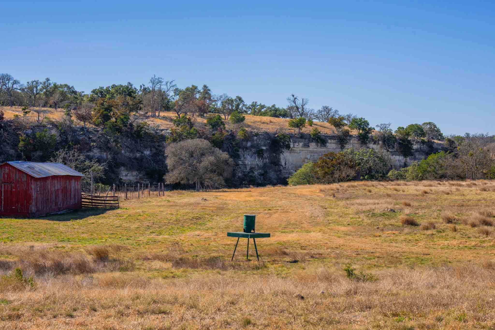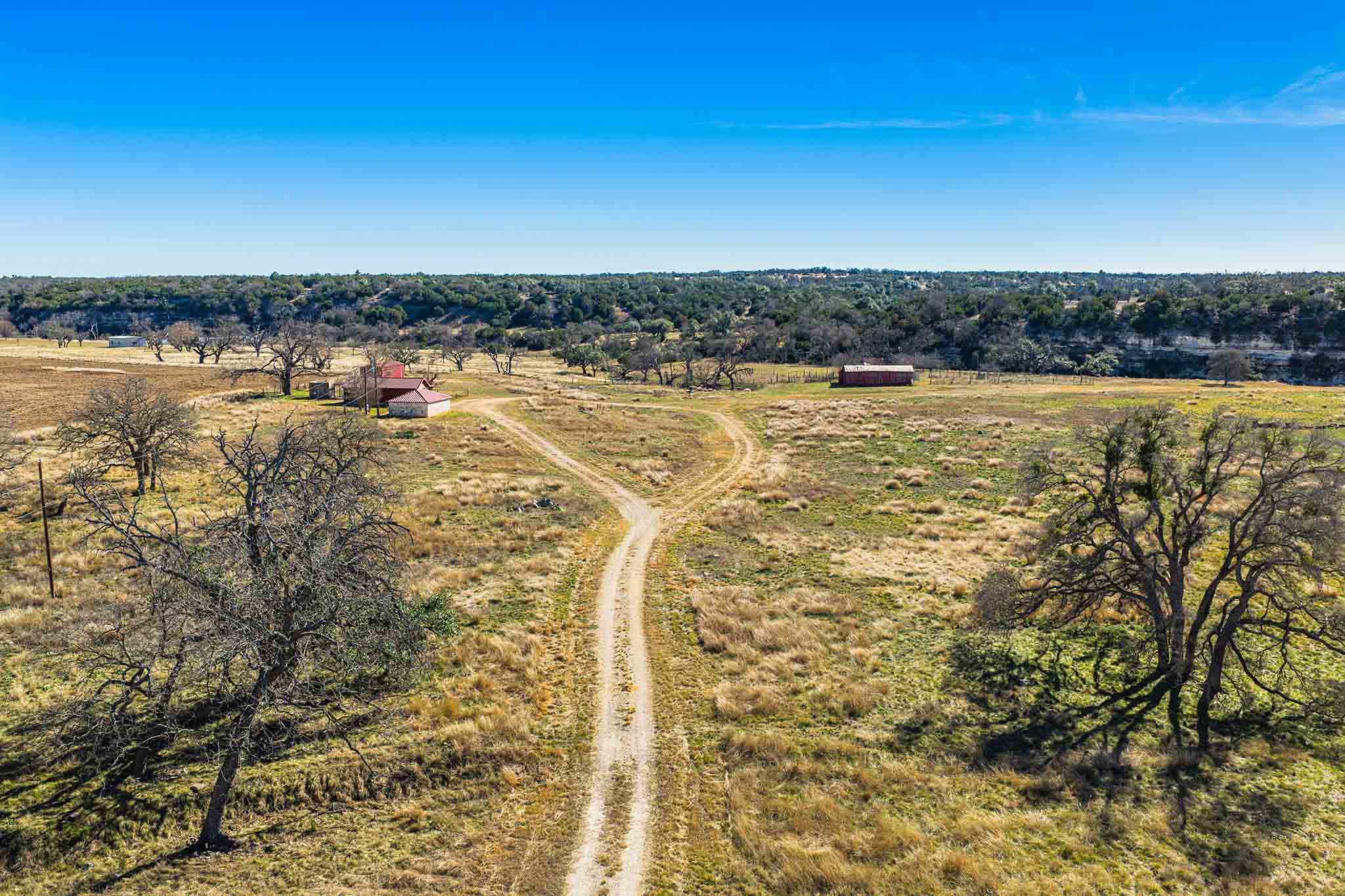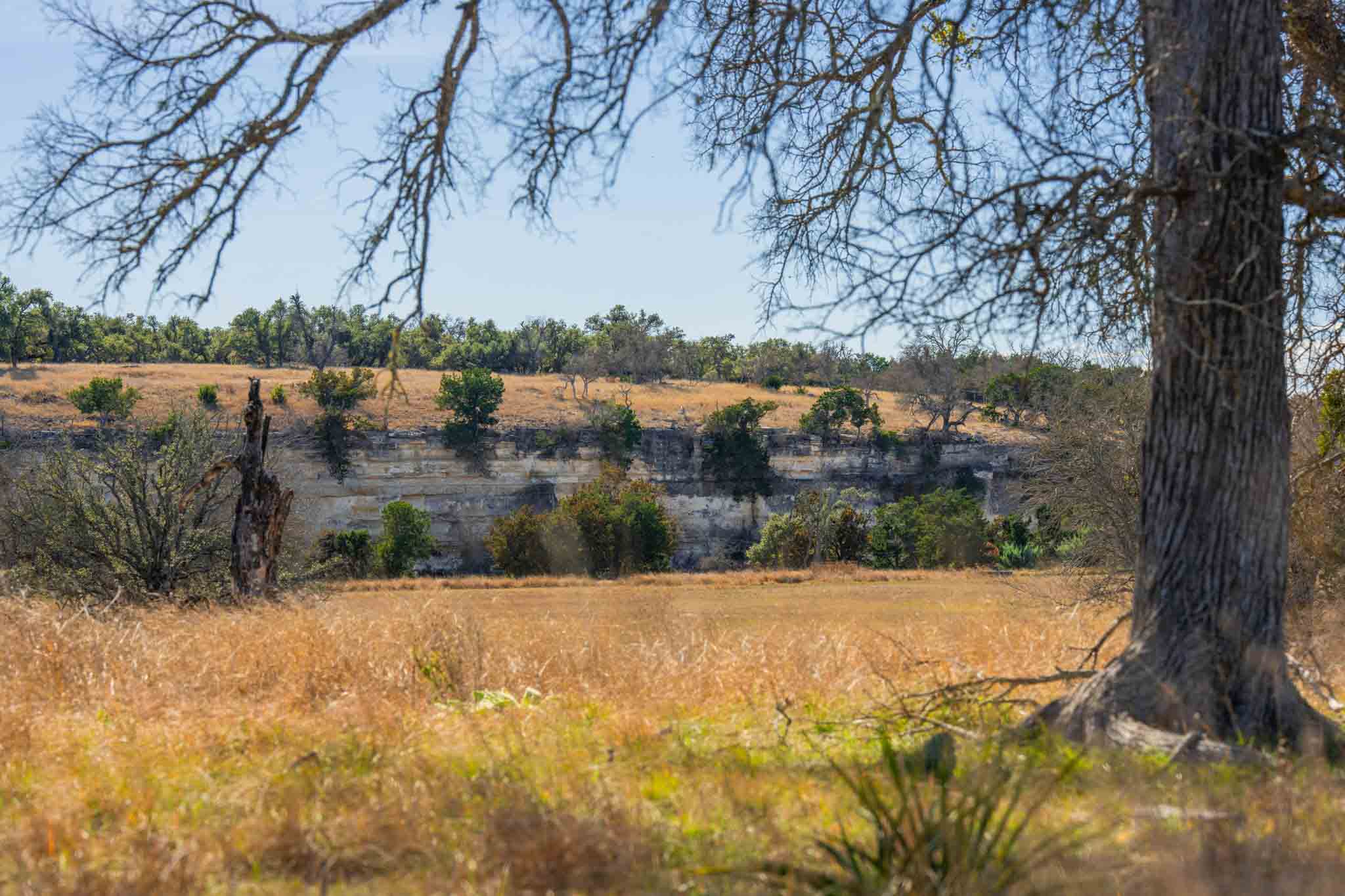 The ranch features gently rolling terrain with approximately 19± acres of productive hay fields, strategically pastured out. The native pasture has benefited from selective cedar clearing over the years, allowing native grasses to thrive and encouraging the growth of hardwoods, including live oak, post oak, pecan, and cedar elm. A pretty draw with interesting rock outcroppings is lined with hardwoods and watersheds down to the river. A particularly inviting area of the ranch is dotted with magnificent cedar elms, offering a potential homesite with elevated views of the dramatic limestone bluff and the Pedernales River below. The terrain has a gentle roll, with elevation ranging between 1,900’± to 1,960’± asl.