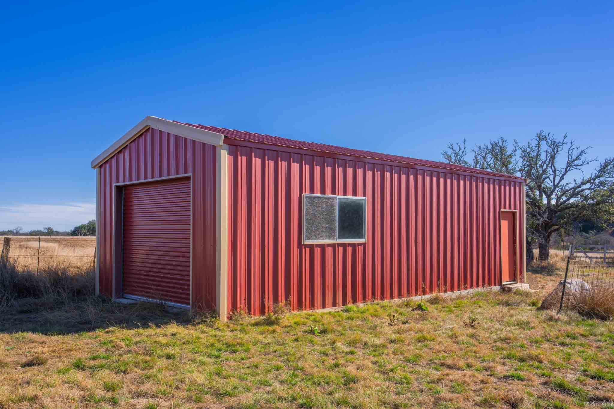 A 525± sf metal barn provides practical utility and storage space. The structure features a roll-up garage door, making it well-suited for equipment or keeping tools and supplies out of the elements. The barn also houses a 2,500± gallon water storage tank, which is part of the water well system.