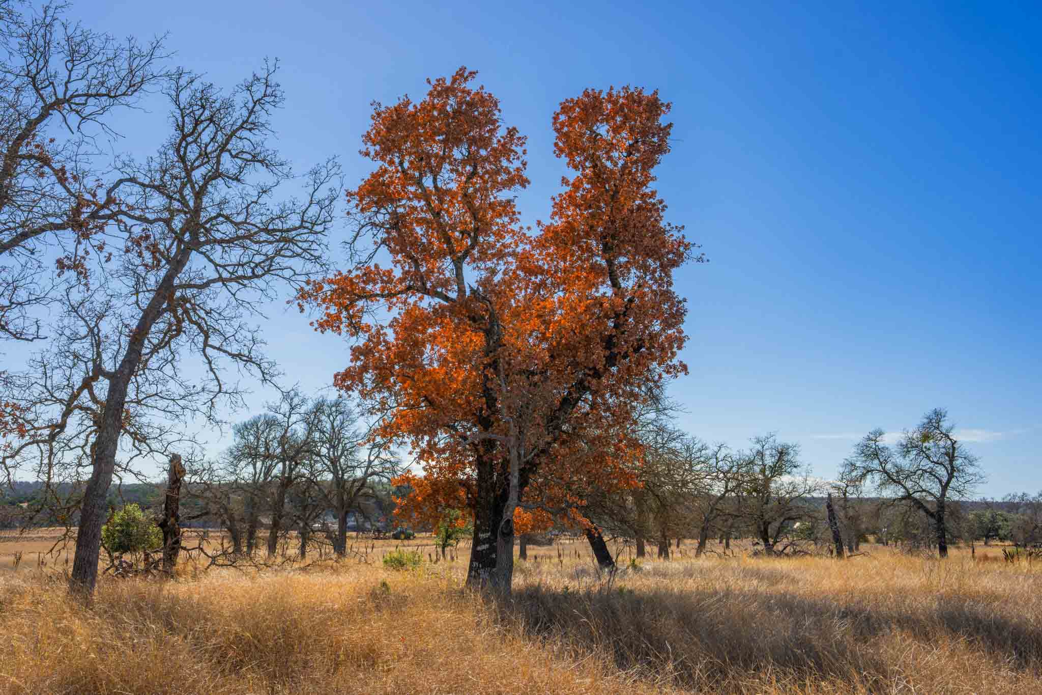 The property features gently rolling terrain with approximately 19± acres of productive hay fields and well-maintained native pastures. Selective cedar clearing over the years has allowed native grasses to thrive and encouraged the growth of hardwoods, including live oak, post oak, pecan, and cedar elm. A particularly inviting area of the ranch is dotted with magnificent cedar elms, offering a potential homesite with elevated views of the dramatic limestone bluff and the Pedernales River below.